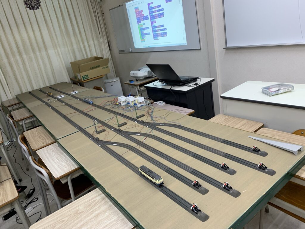 午後の部では信号機も使い、発車するときは信号機が青になっている。両端を駅に見立てているので侵入の時には信号は無視してOK。手前の駅は往復の度に分岐を切り替えて1番線の次は2番線に停車、次はまた1番線に停車。これを永遠に繰り返しましょうということをやっています。